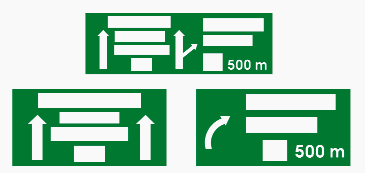 Σχ. 9.32 Προειδοποιητική κατευθύνσεως προς κόμβο, στα 500 m πριν από τον κόμβο. Από τον αυτοκινητόδρομο θα αφαιρεθεί λωρίδα από τη θέση του κόμβου και μετά |